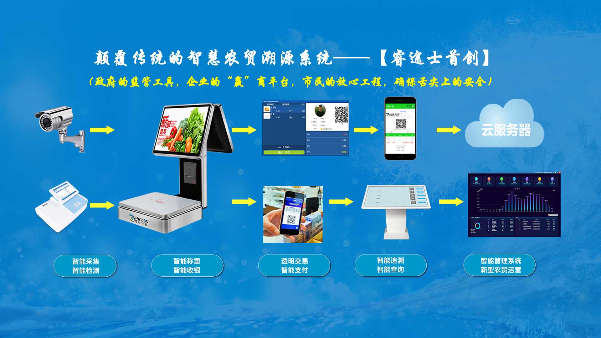 創(chuàng)新實現了【智慧農貿溯源管理系統(tǒng)】與【智能稱重收銀】一體化解決方案,集市場管理、運營管理、溯源追溯、智能收銀大數據運用于一體,硬件、軟件與管理系統(tǒng)完美結合。適用于農批、農貿市場蔬菜、生鮮、水果、水產、肉類、熟食等稱重和非稱重銷售;由于采用一體化設計,解決了傳統(tǒng)農貿市場無法實現的信息化、智能化、可追溯的管理問題;使稱重、收銀、追溯、管理、更透明、公正、安全,讓顧客無后顧之憂,給管理工作帶來極大的便捷與高效,對國內農產品行業(yè)的發(fā)展、農產品流通管理起到了典范作用。 【睿途士首創(chuàng)】顛覆傳統(tǒng)的“智慧農貿市場系統(tǒng)”,解決了傳統(tǒng)農貿系統(tǒng)單一安卓掛屏,昂視不方便看、不直觀、無互動性,傳輸信息不齊全、不穩(wěn)定的問題,也解決了按鍵電子秤商品難找、商品代碼難記、按鍵操作不靈活、支付不智能,對收銀管理、銷售商品、菜名、菜價、打折、優(yōu)惠、會員、線上下單、采購等無法實現實際菜品交易和追溯等問題。 更具顛覆性的是睿途士智慧系統(tǒng)擁有三大管理平臺(市場管理平臺、總部運營管理平臺、商戶后臺管理平臺)、一個可視操作前臺和三大追溯功能,讓遠程管理、數據傳輸、人機互動、智能控制、移動支付、大數據、互聯通信、云端存儲、人工智能、智能城市、電子定位、智能收銀等功能得以實現。